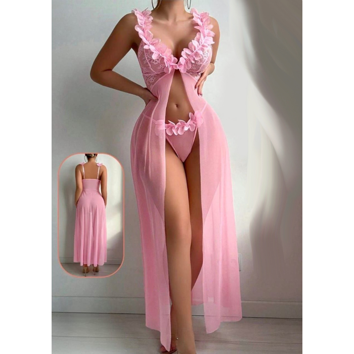 Pink Lace Mesh See Through Transparent Babydoll Nightwear Lingerie BC103