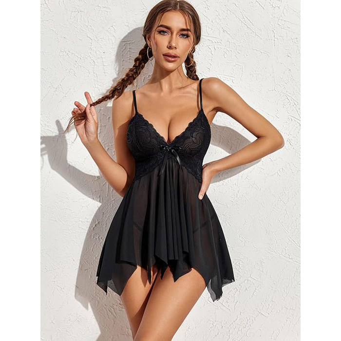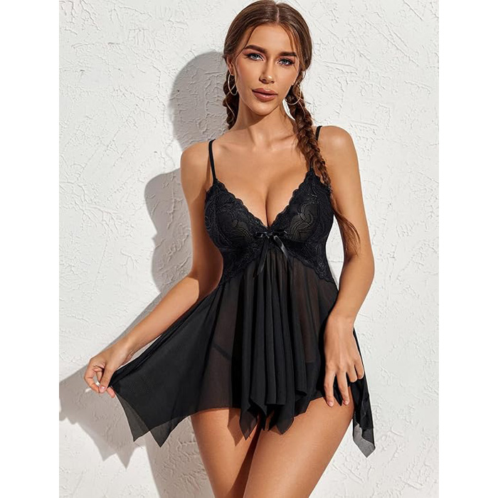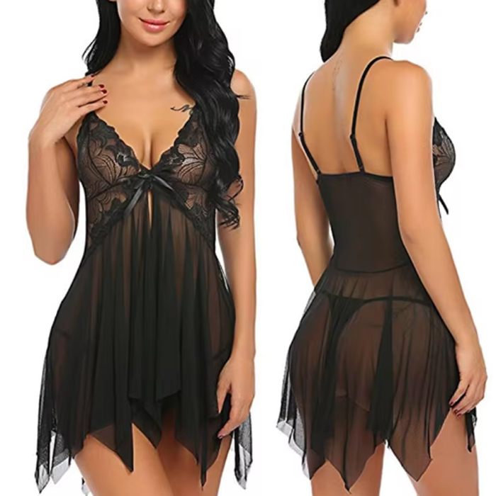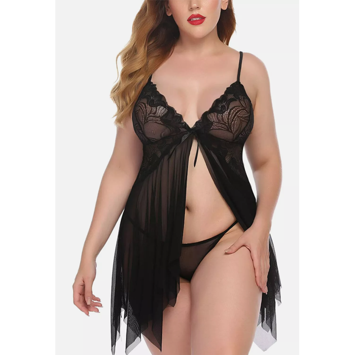 Black Romantic Lace Babydoll with Thong
