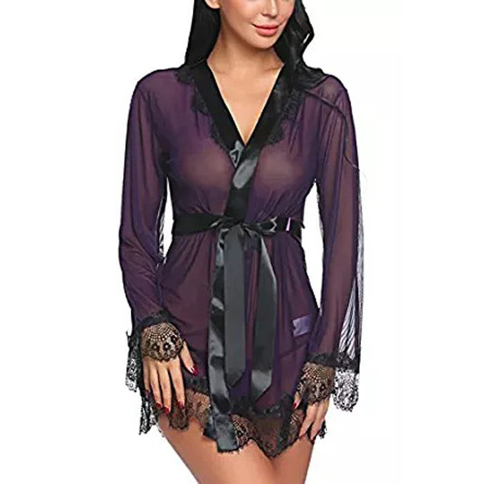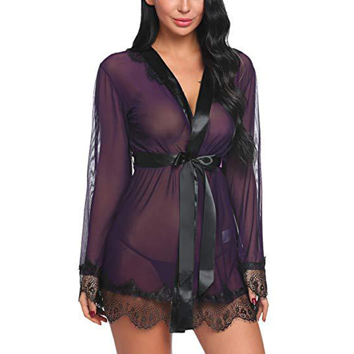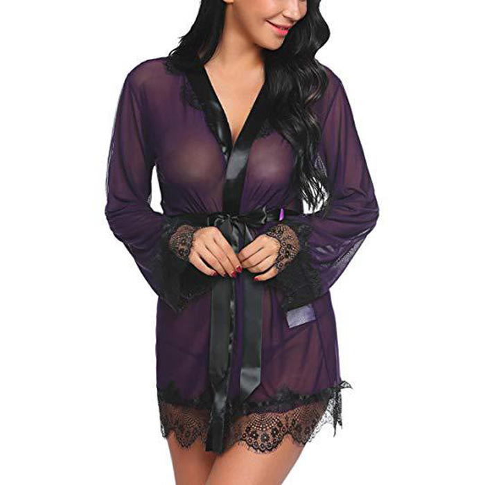 This short kimono robe is designed with scalloped eyelash lace-trimmed cuffs and hem with bell sleeves. Includes matching thong.