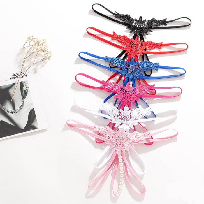 Sexy Embroidered Flower Open Crotch Pearl G-string