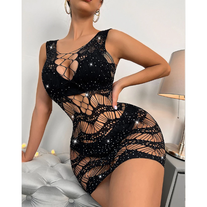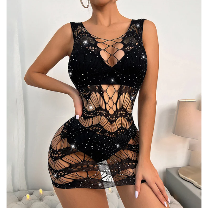 This elegant mini dress is made from soft, stretch fishnet fabric with shimmering rhinestones