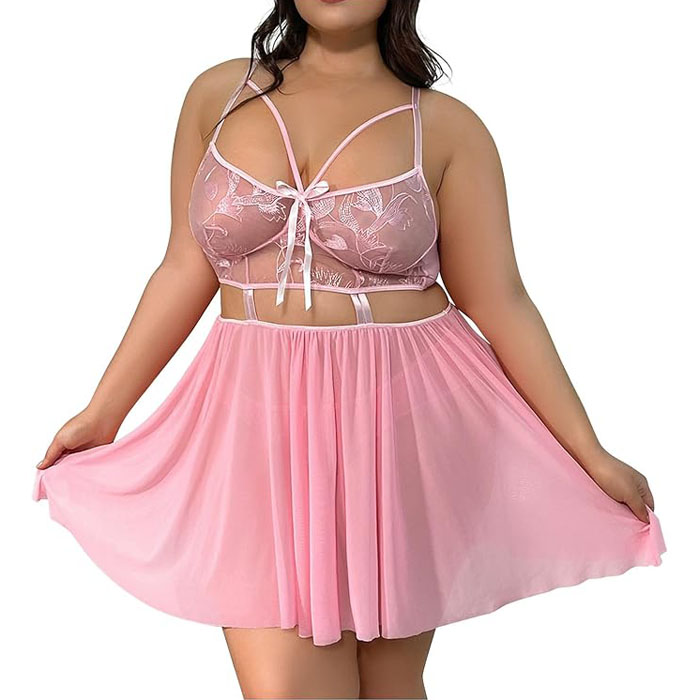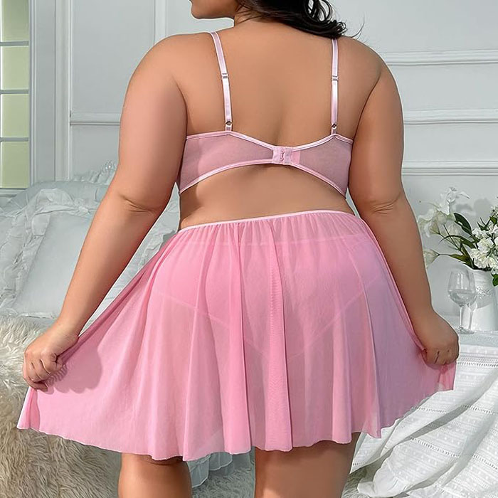 Plus Size Floral Embroidery See Through Babydoll Mesh Lingerie Set with Panty