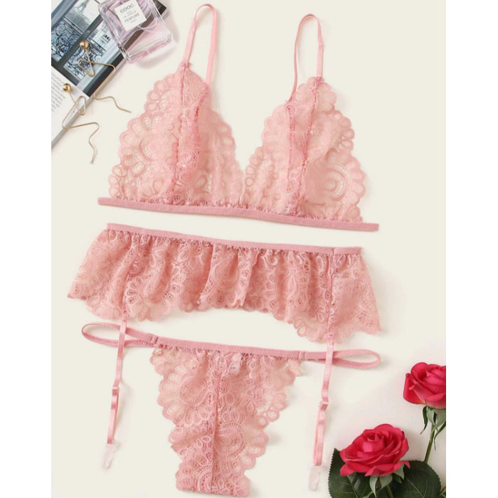Soft Lace Bralette Panty and Garter Set Peach LSG114R