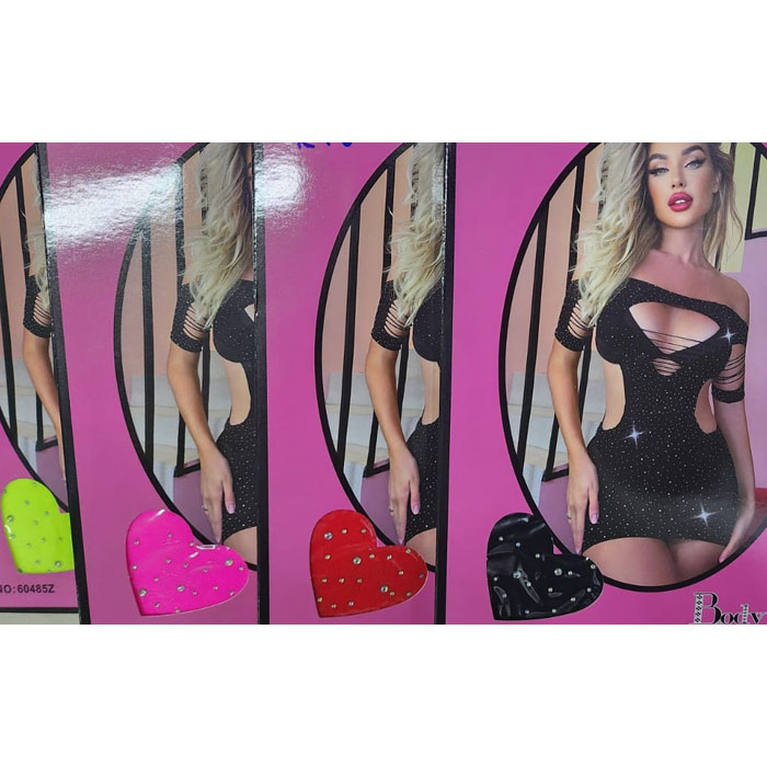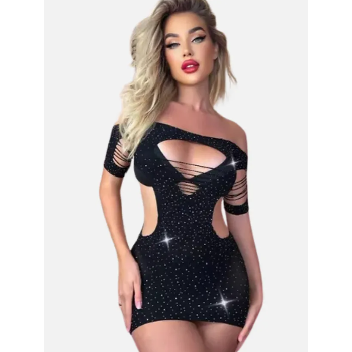This elegant mini dress is made from soft, stretch rhinestone decorated fishnet fabric.