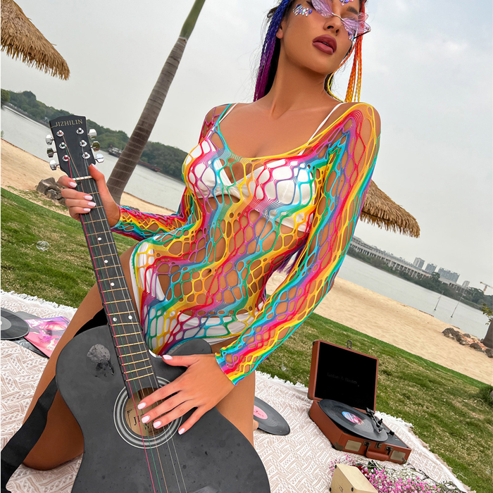 Zone Sexy Rainbow Fishnet Teddy Lingerie Beach Cover Up Made from soft, stretch fishnet fabric. TYR5