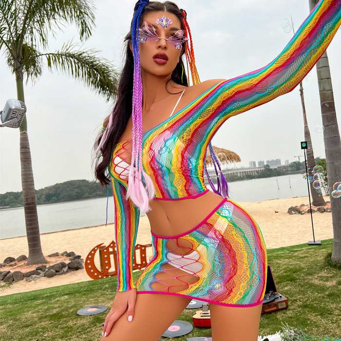 Zone Sexy Rainbow Fishnet Top & Skirt Lingerie Beach Cover Up
